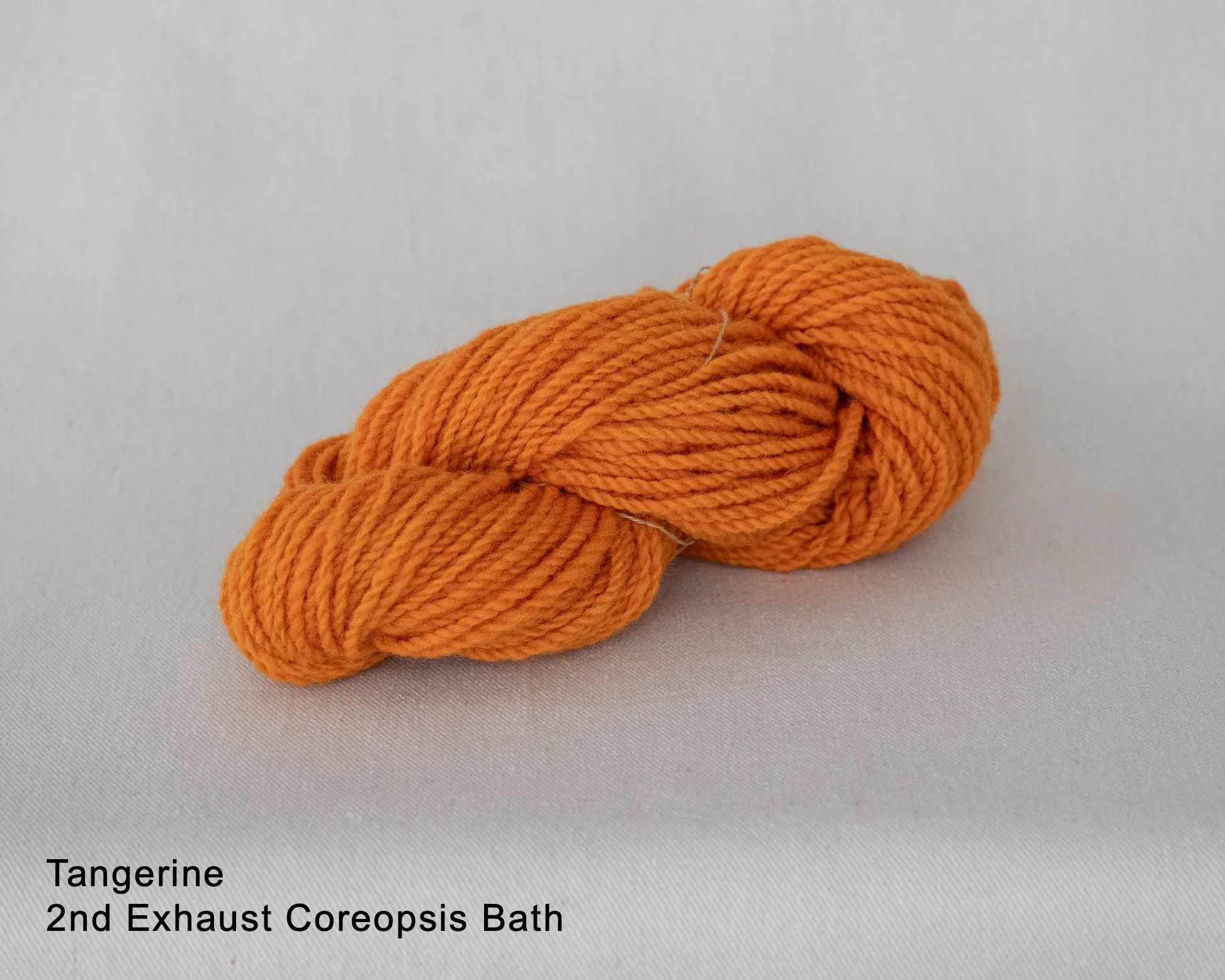 We have been using Dyer’s Coreopsis for a couple of years now. We reliably achieved a deep orange. However, we have found that if the dye with fresh or dried flowers, we will get a slightly different shade of orange. The exhaust bath produces peach shades.
