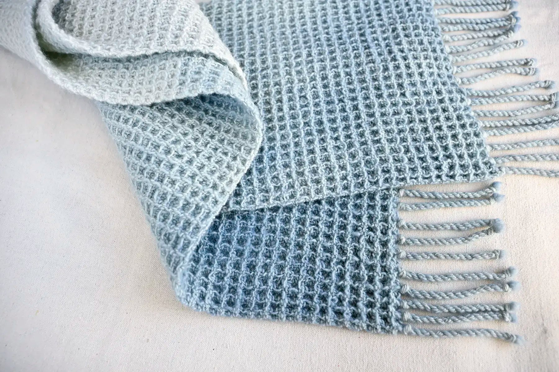 This scarf's handwoven waffle design allows the wearer maximum warmth while remaining light and easy to wrap. The wool is Rambouillet, a true Prairie style wool from a Merino type sheep breed. The beautiful dove coloured grey is from a shepherdess in Montana who has taken it upon herself to breed the most luscious fleeces you can find. The natural white Rambouillet is sourced from Alberta.